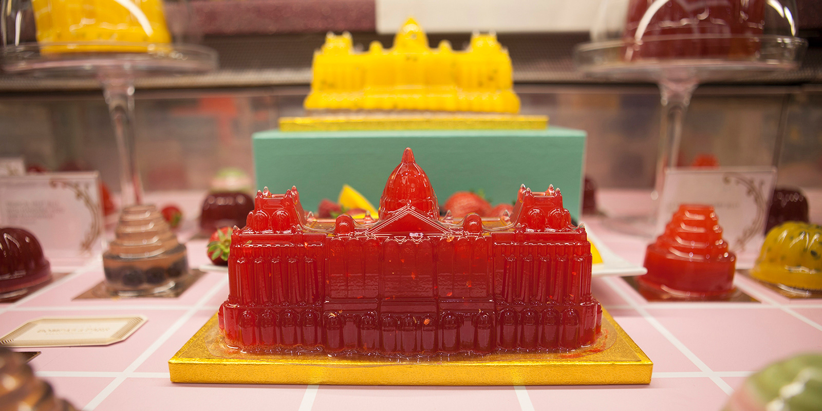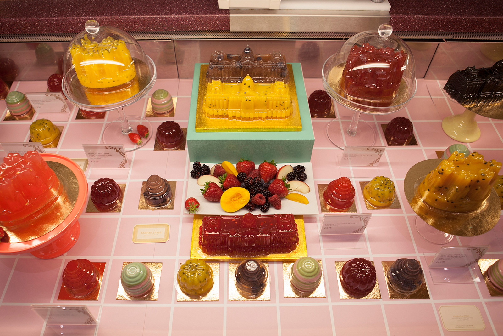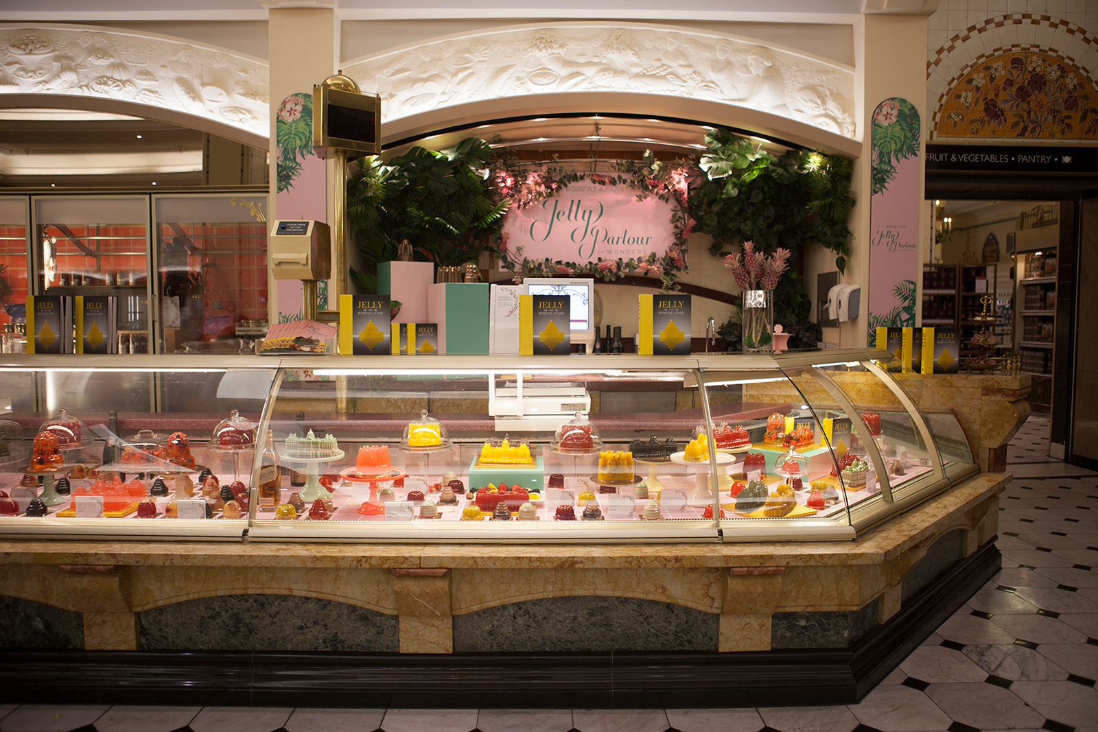 Harrods Food Hall welcomed the pop-up shop Jelly Parlour of Wonders to celebrate Bompas & Parr’s ninth birthday. The installation was the first retail jelly shop of Bompas & Parr. Visitors could choose from a range of jelly shapes and flavours, including a model of Harrods department store.